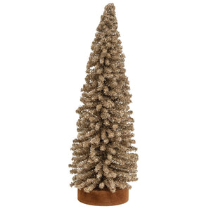 Add extra brightness to merry holiday decor with the Champagne Gleam Bristle Tree, 10". This pretty tree has sparkling bristled branches in a champagne gold tone and stands 10" tall. It has a round wooden base that measures 2.5" in diameter. Add this tree to the side of a box sign or mix with other trees for easy but charming displays!
