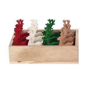 Bring winter wonderland charm to Christmas decor with this assorted flocked deer in a box. These velvety soft deer figurines offer a modern take on holiday classics, adding a cozy texture to any display. Whether arranged on a mantel or under the tree, this assorted set brings a touch of forest magic to any home. Material(s): Flocked Resin, Wood Crate.