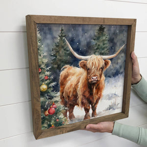 Highland Cow Christmas Tree - Framed Holiday Animal Canvas: 6x6" Mini Canvas Art with Wood Box Frame