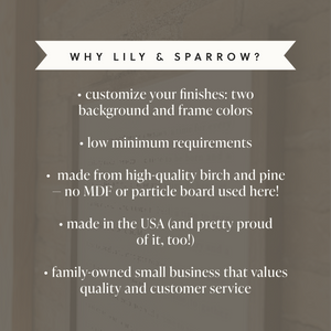 SIZE: approx. 8x12", 13x17", or 17x25" {may vary within a half inch} FRAME COLOR: light oak or dark walnut BACK: unfinished, natural birch; Lily & Sparrow stamped logo OTHER: hanging hardware not included; intended to be hung from frame Our wall art and home decor is handcrafted in our workshop in Wisconsin. Since our wall decor is handmade, it can vary slightly and no two wood signs will be alike. This is what makes our signs unique — they're truly one of a kind. Thanks for supporting our family-owned small business! Home Decor, Signs, Wall Decor, Wall Art, Handmade in the USA, Wood Signs